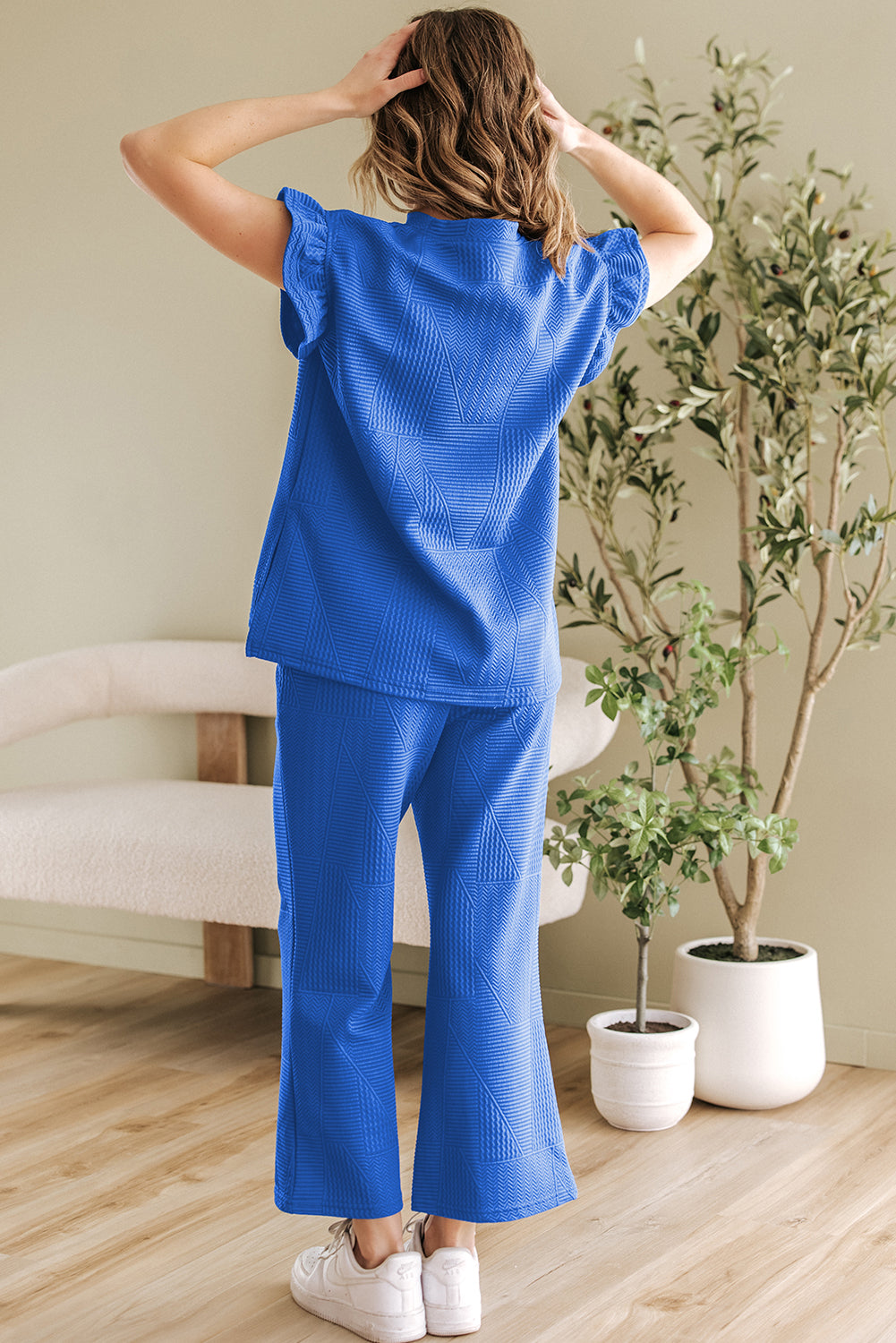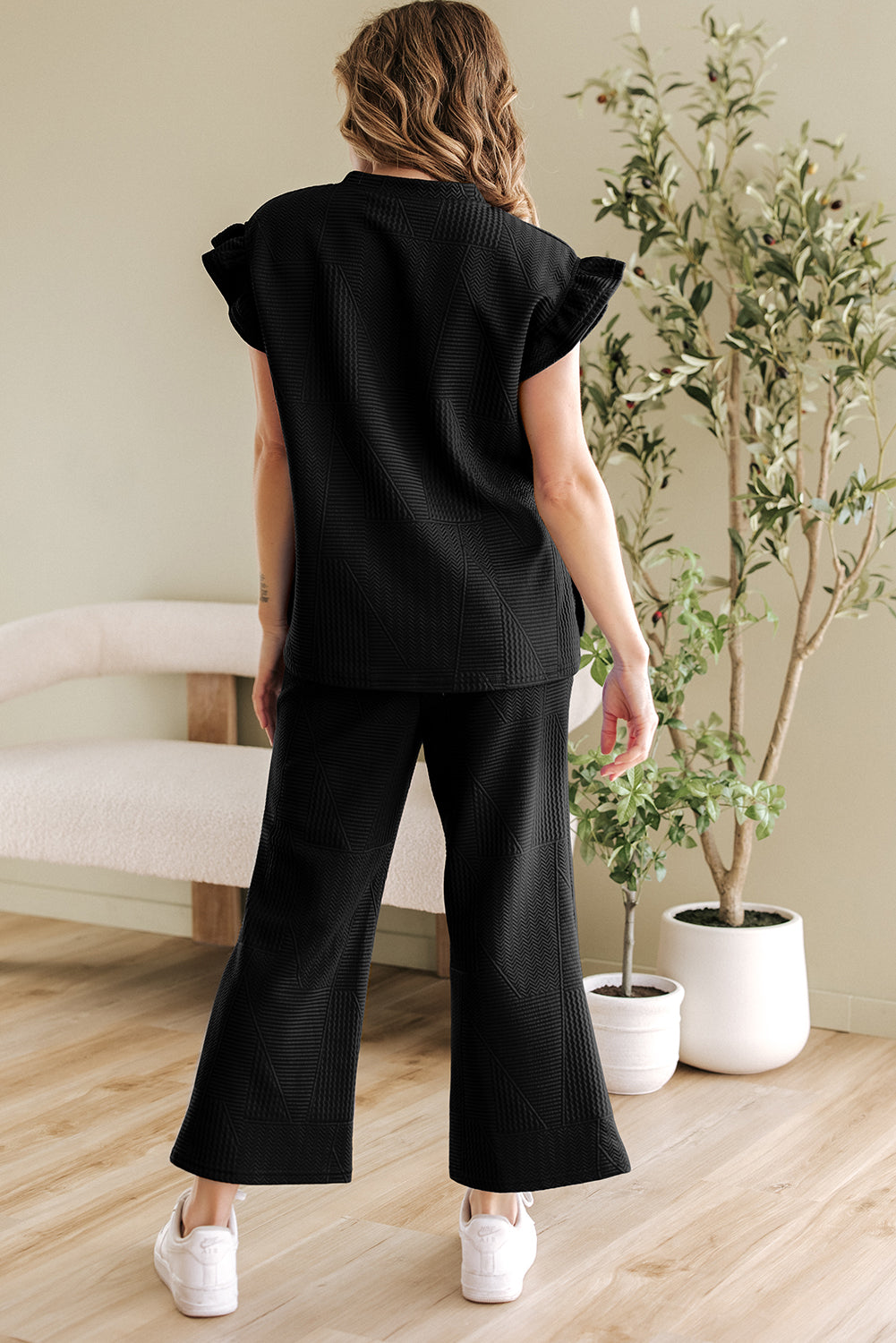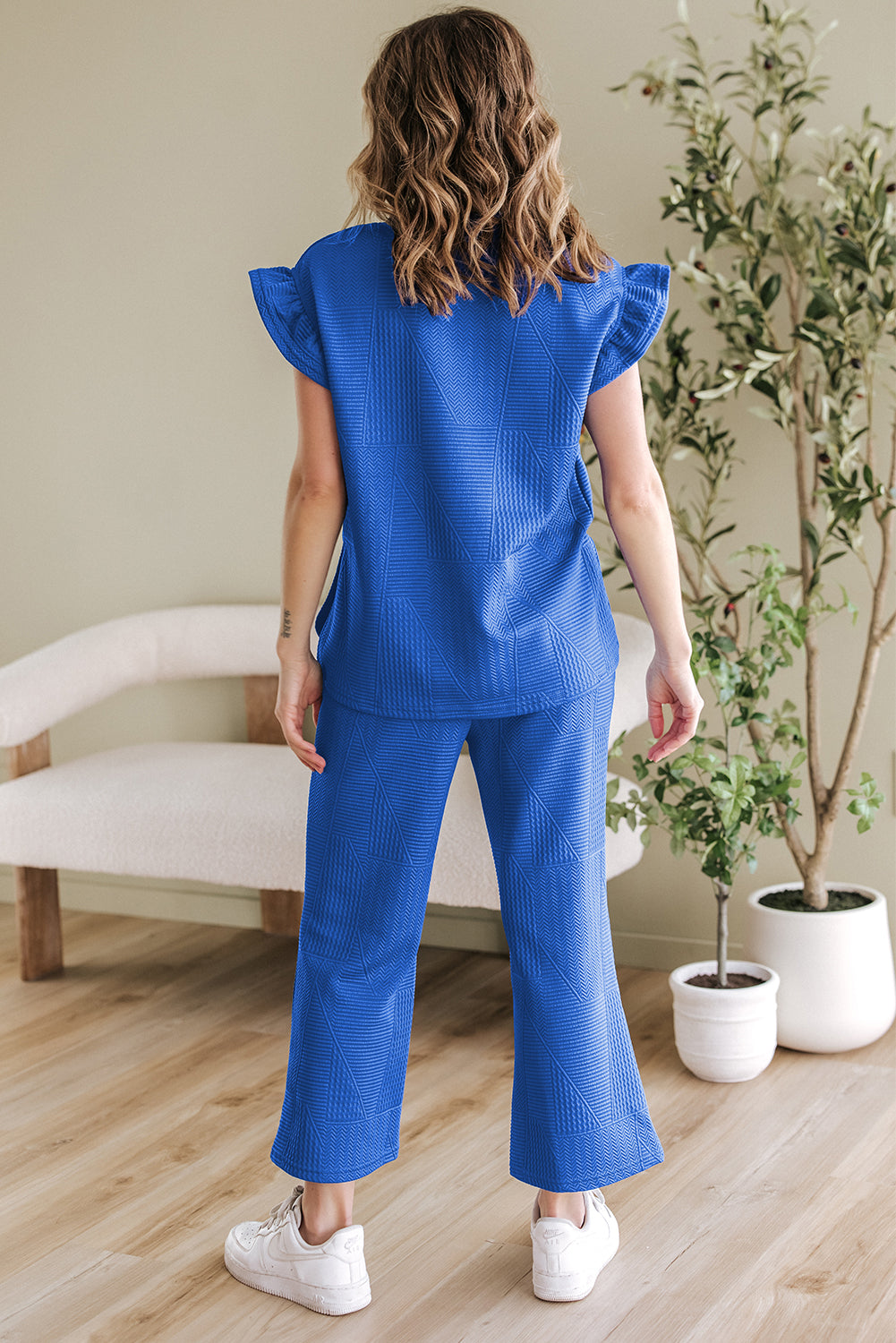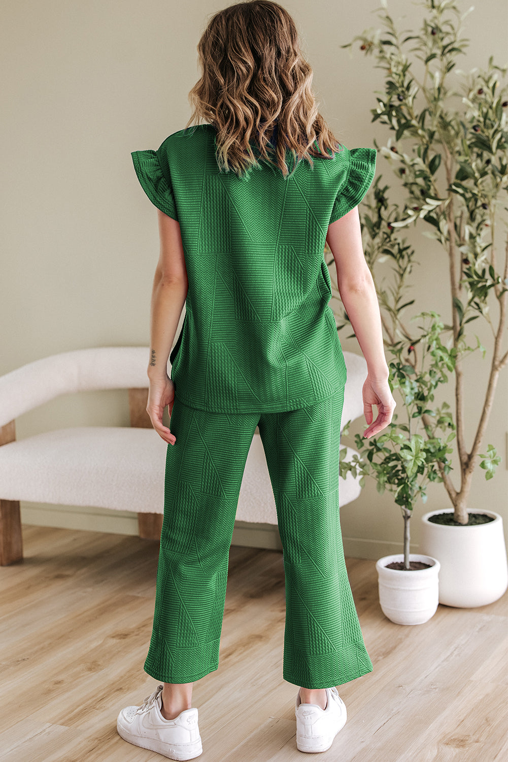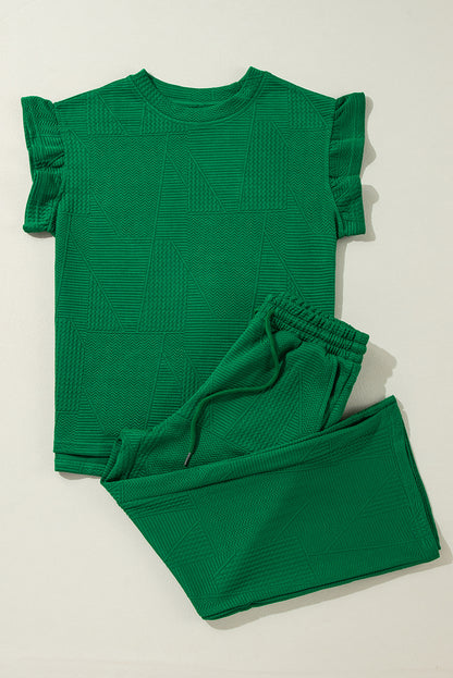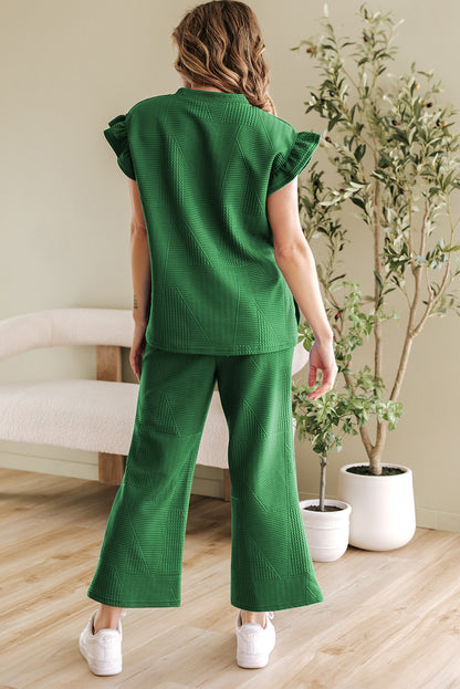It includes a ruffled sleeve top and a cropped pants