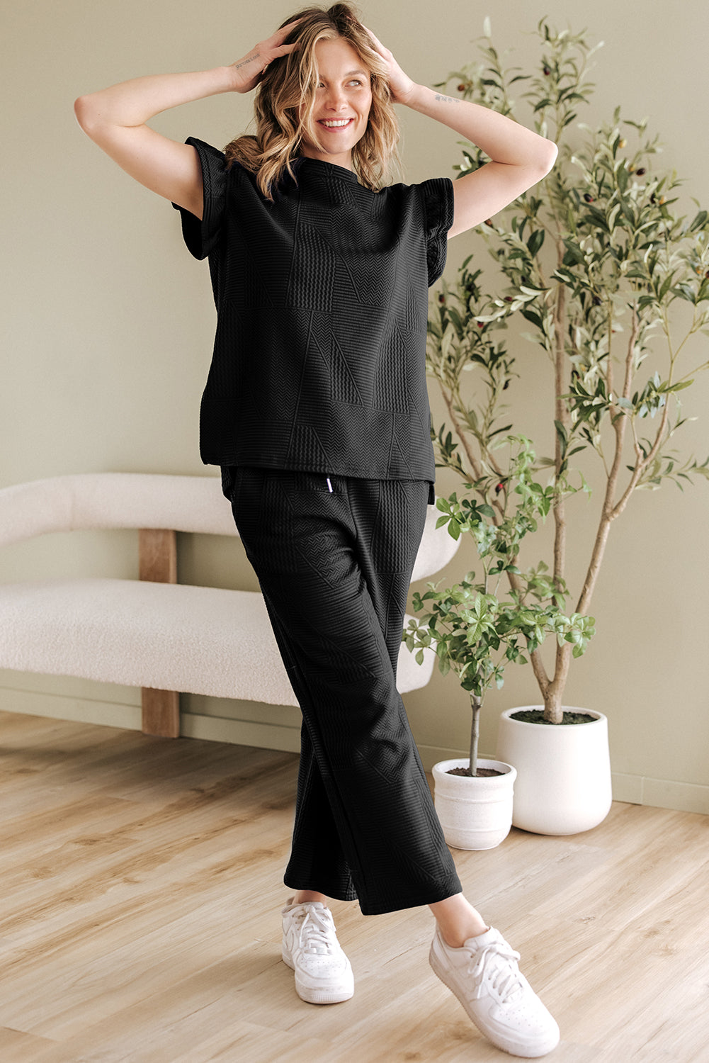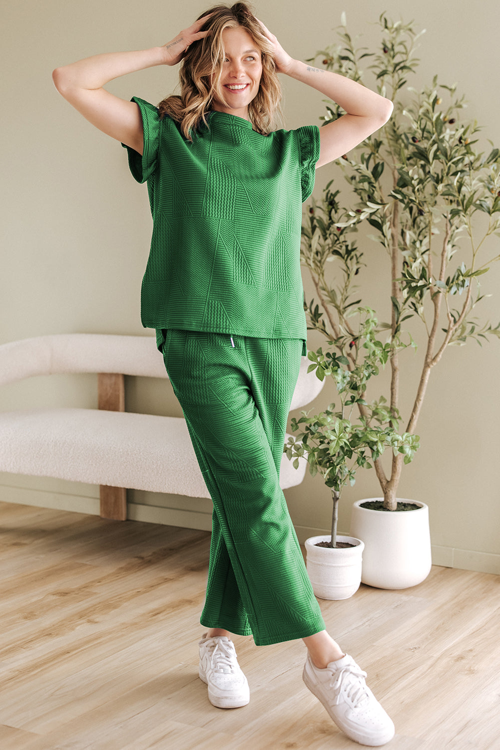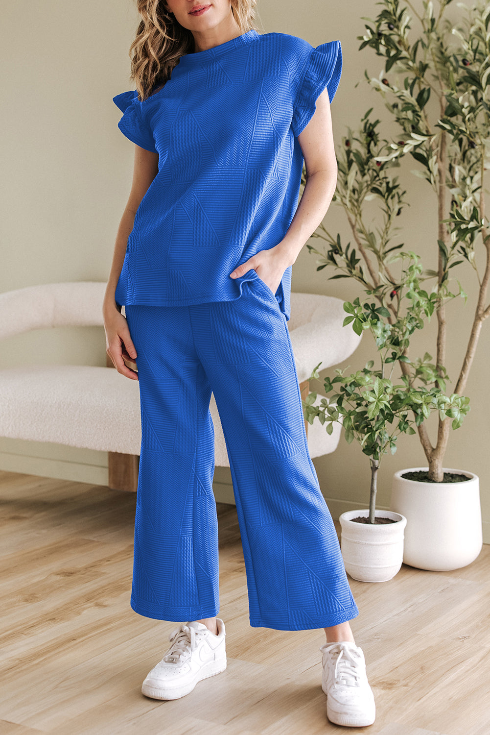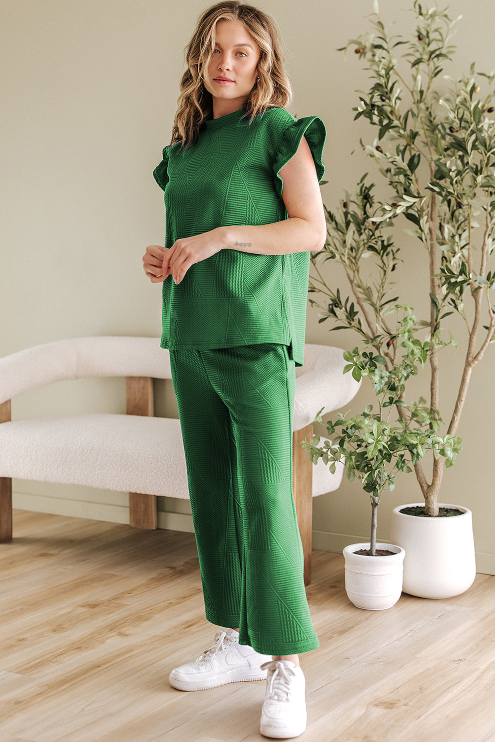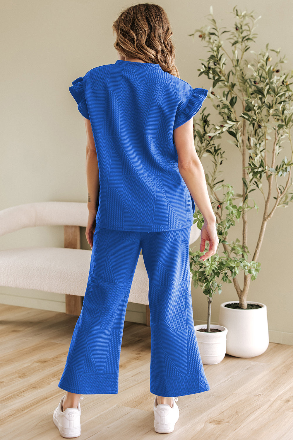 It includes a ruffled sleeve top and a cropped pants