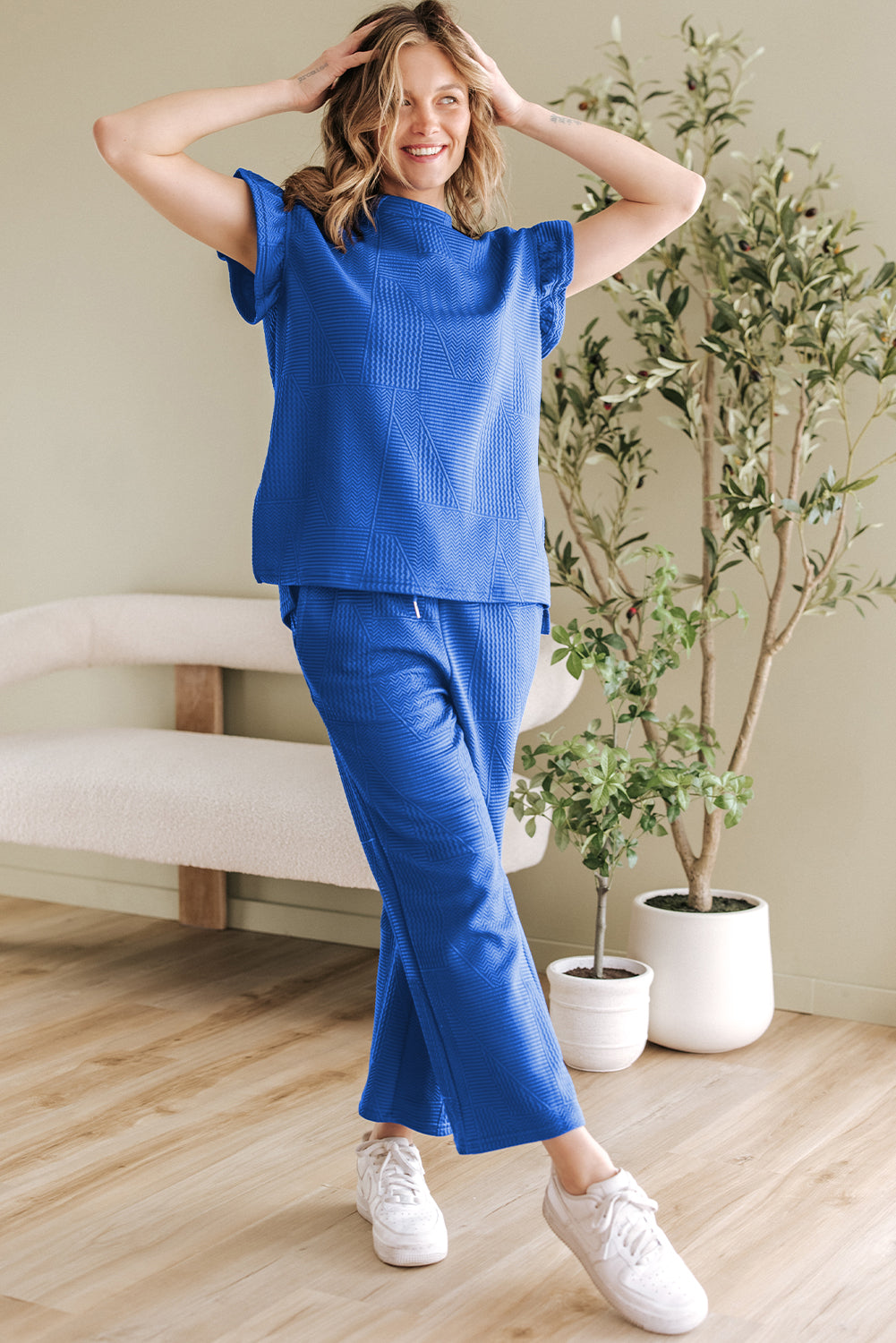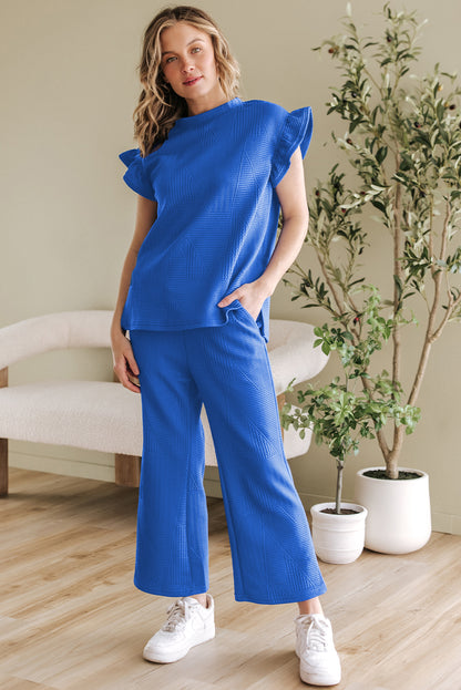 Dark Blue Ruffled Sleeve Summer Top and Cropped Loose Pants Set